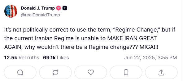 Because Trump wants freedom for the Iranian people and to make Iran "economically bigger, better, and stronger than ever before.” But this will be “no nation building quagmire” according to Defense Secretary Hegseth.