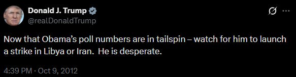 Well, perhaps someone does. In fact, Trump himself answered this question years ago with characteristic bluntness. In 2013, he tweeted: “Now that Obama’s poll numbers are in tailspin – watch for him to launch a strike in Libya or Iran. He is desperate.”